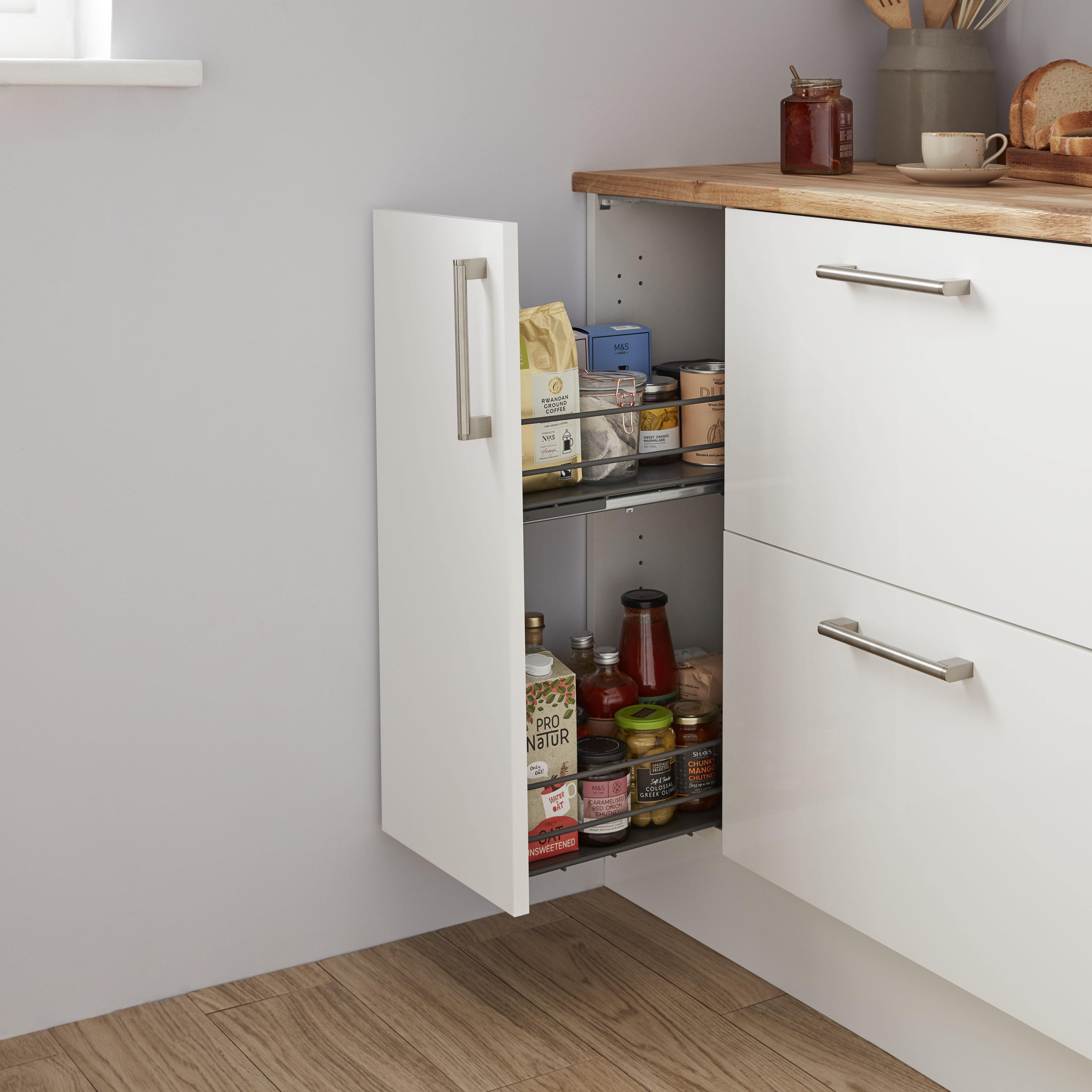 This Caraway 100cm white base cabinet has tough 18cm thick panels and ABS protection on the front edges for impact resistance. WHITE BQ KITCHEN UNIT CABINET 300mm Larder Shelf Pack Cooke Lewis 18mm CLICK. Flat pack options are available on all kitchen base units if required.