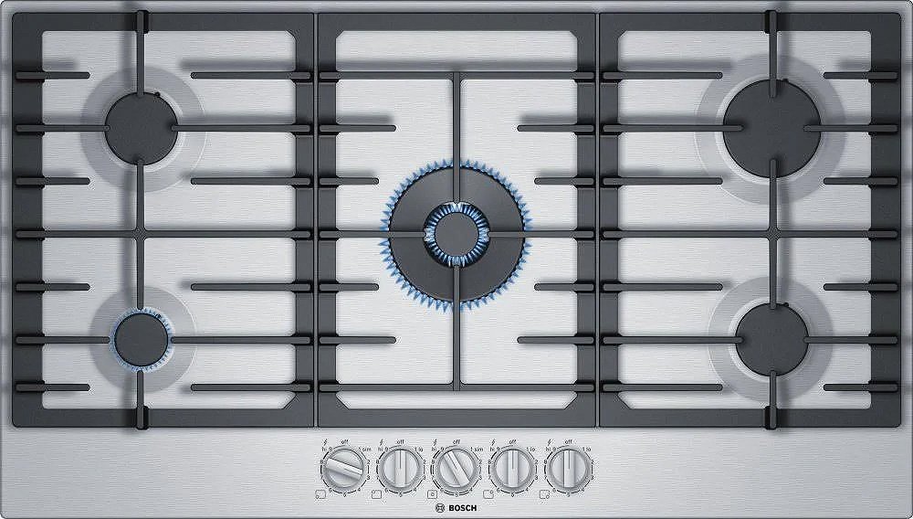 Buy Bosch 800 Series 30 Stainless Steel 5 Burner Gas Cooktop. 36 Gas Cooktop 800 Series - Stainless Steel NGM8655UC Features and Benefits Heavy-Duty Metal Knobs for a Premium Look and Feel Low-Profile Design for an Integrated Appearance Centralized Controls for Easy Use and Intuitive Operation of the Cooktop Cooktop Design Coordinates with Bosch Ovens and Ventilation. Powerful 18000 BTU Center Burner Speeds Cooking Time.